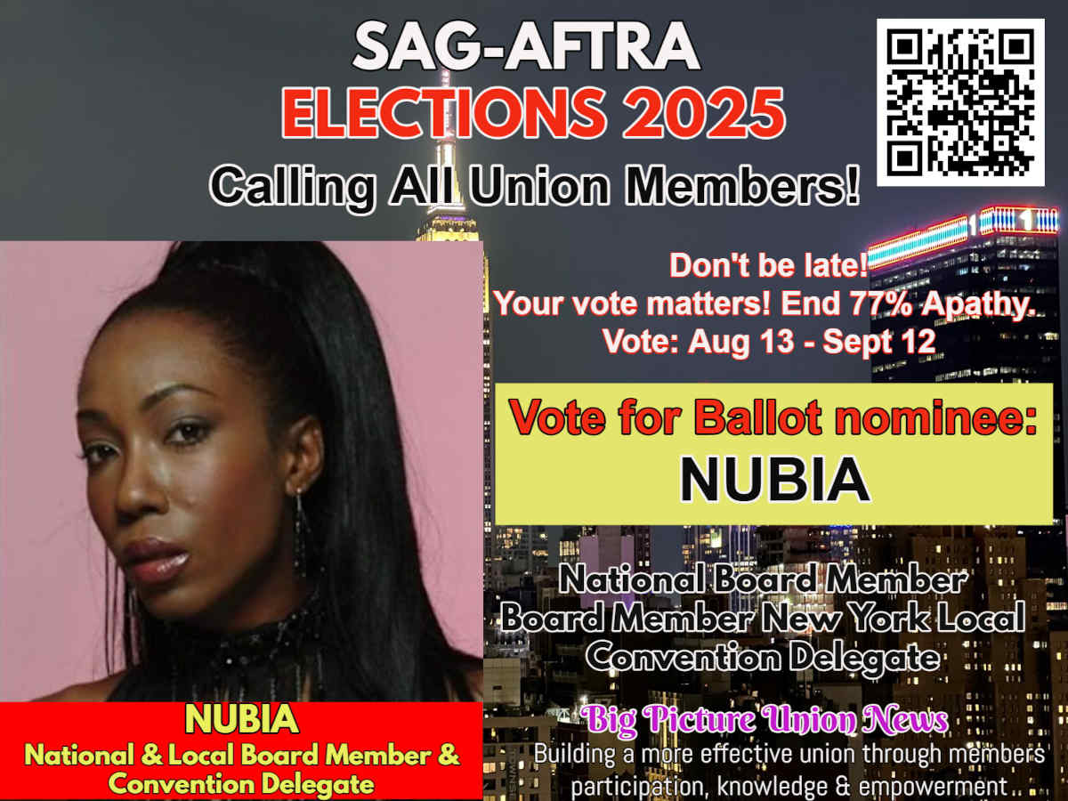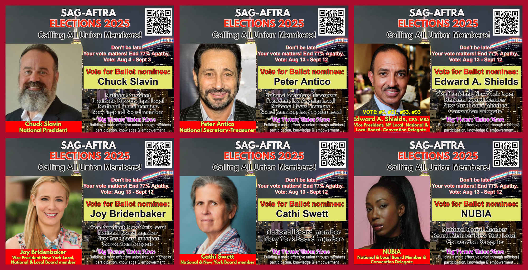 Dear fellow SAG-AFTRA members, We are respectfully asking you to vote for the candidates shown below during SAG-AFTRA election that started on Aug 4th in some states (August 13 in NY & LA) to Sept 3rd in some states (Sept 12, 2025 in NY & LA): National President, National Board, New England Local President, New England Local Board and Convention Delegate National Secretary-Treasurer, National Board, Los Angeles President, Los Angeles Local Board and Convention Delegate President New York Local, National Board, New York Local Board and Convention Delegate Vice President New York Local, National Board, New York Local Board and Convention Delegate Los Angeles Local Board and Convention Delegate National Board, New York Local Board and Convention Delegate President Miami Local, Vote #6 National Boad, New York Local Board President Philadelphia Local, National Board, Philadelphia Board